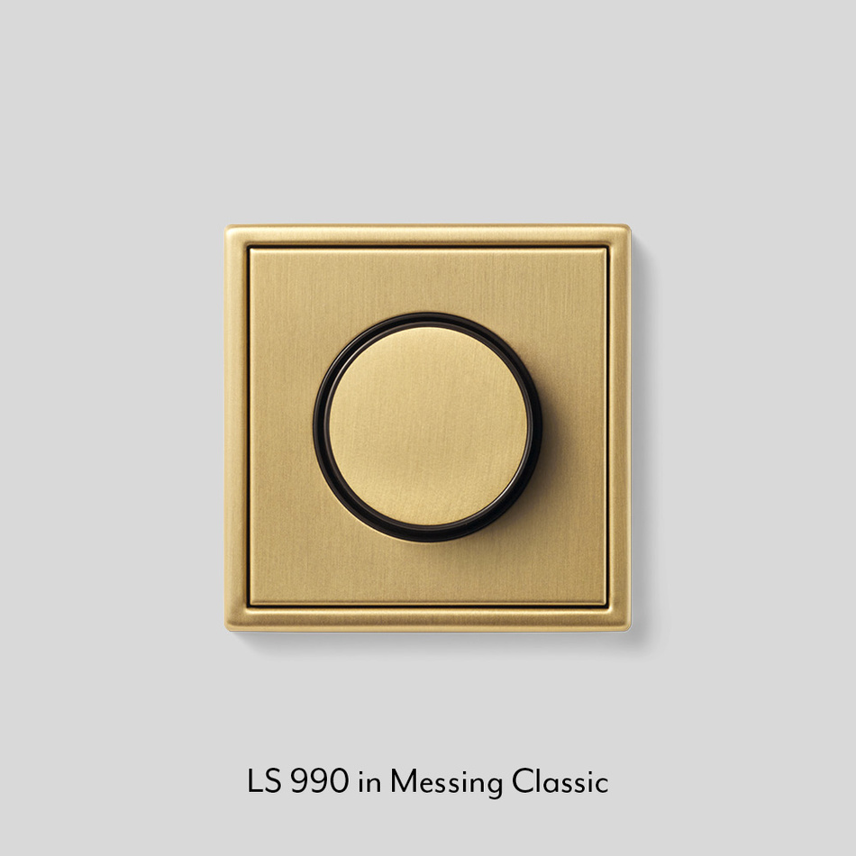Die neue Gestaltung für Drehdimmer-Abdeckungen wirkt noch harmonischer, die Bedienung ist einfacher. Das flachere Design steht für Drehdimmer, Drehzahlsteller, Potentiometer und Drehregler zur Verfügung. In den Schalterprogrammen aus Echtmetall ist die Vorderseite des Drehknopfs nun aus demselben Material. Darüber hinaus übernehmen die gebürsteten Varianten Messing Antik und Messing Classic ihren speziellen Schliff nun auch für den Drehknopf.